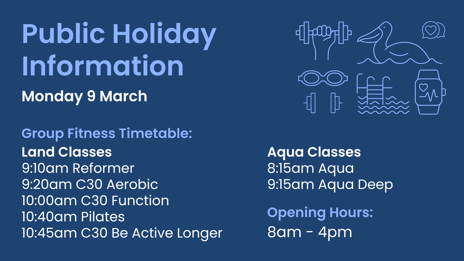 The centre's facilities offer you a fully equipped lifestyle gym featuring a wide variety of cardio equipment and weights, a functional training area and group exercise classes. With over 50 group fitness classes a week, there is a class for everyone!